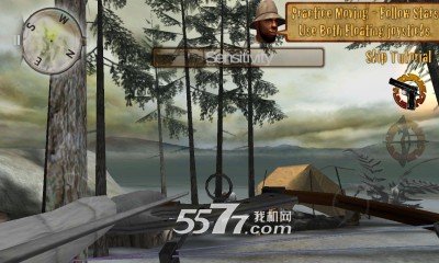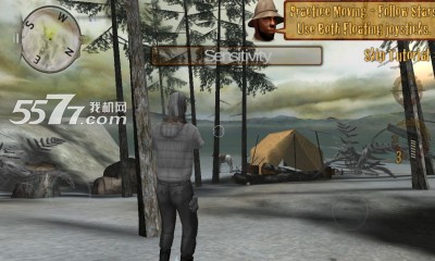 本作采用了第一人称视角,操作方式与常见的FPS游戏相似。不过,在攻击时需要先按下右侧的瞄准键拔枪,再按左侧的射击键进行射击,这样的设计显得有些复杂,而且射击体验也略显奇特。移动控制通过摇杆实现,尽管右下角没有明确显示,但点击后可以跳跃;左上角则用于使用望远镜。此外,玩家还可以模仿野兽的声音来吸引它们靠近。整体来说,游戏难度较高,很容易死亡。一旦被野兽追到就会立刻被击杀,并且死亡后之前的得分将全部清零,这种惩罚机制相当严厉。