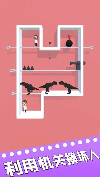 这是一款有趣的休闲闯关游戏,你的目标是解救被困的人员。你需要运用各种方法来营救他们。如果不小心,恐龙会把他们吃掉。此外,游戏中包含多个关卡,每个关卡都充满了各种威胁。