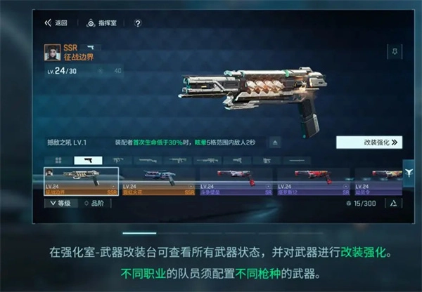 不同职业的队员仅能配备对应职业的武器。在【强化室-武器改装台】处,能够查看所有武器的状态,并且可以对武器进行改装和强化操作。