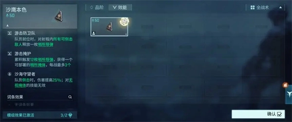 当等级提升至25级和35级时,玩家将分别获得一块沙鹰本色模组与一块可自主选择的战术模组。每一位队员都至少精通两种战术。若编队里擅长某类战术的队员数量达到特定要求,即可触发对应的战术模组,从而获取强大的增益效果。以【沙鹰本色】模组为例,它能让队员在入场瞬间,对射程内所有可进行侧击的敌人发射一枚导弹。