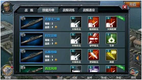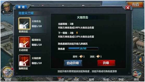 每艘舰船最多可有三个技能,其中普通攻击技能一个,主动攻击技能一个,旗舰技能一个(部分舰船无旗舰技能),所有类型的技能均可以进行升级。每个技能升级时消耗一定数量指定的道具,使用该道具后根据一定概率会有两种结果:技能升级成功、技能升级失败但熟练度增加