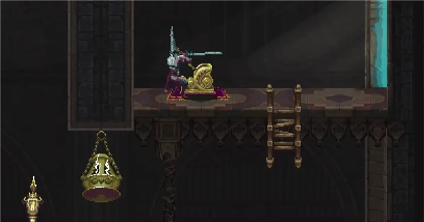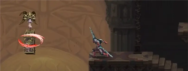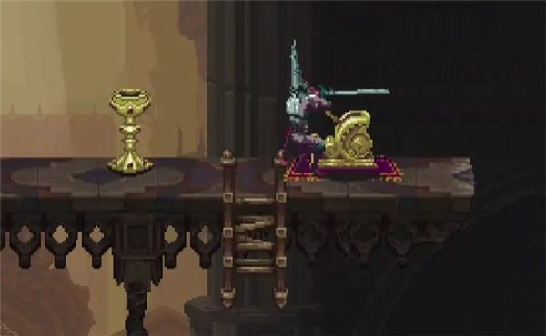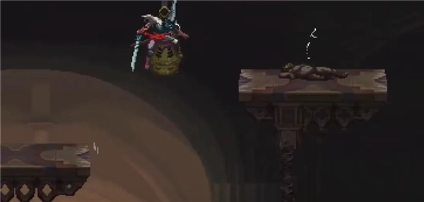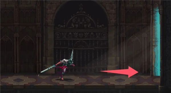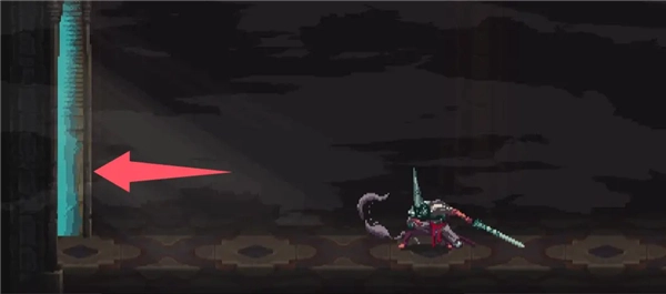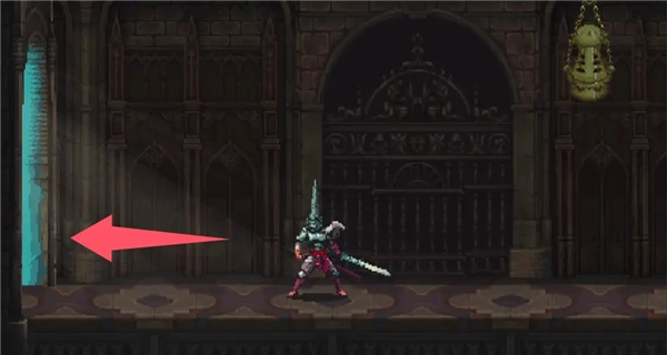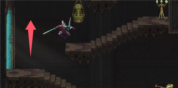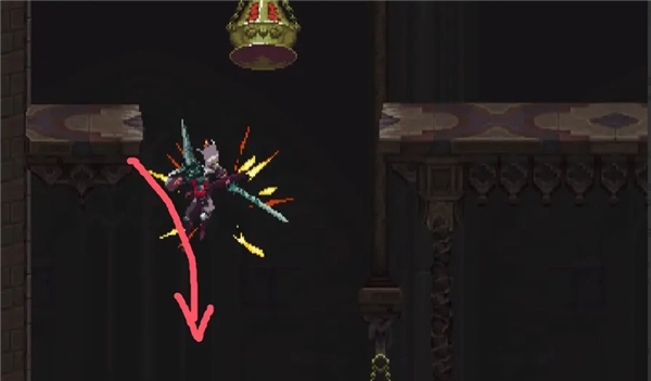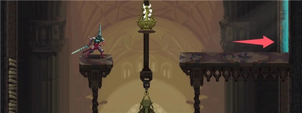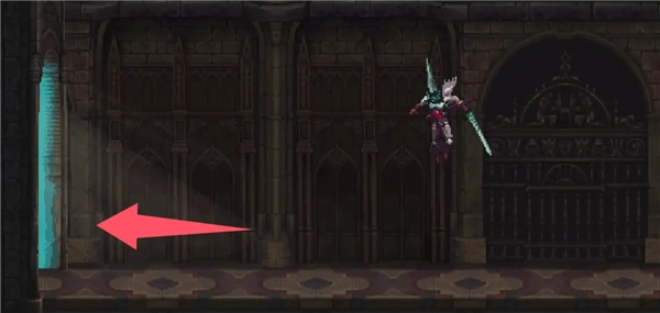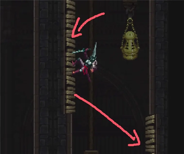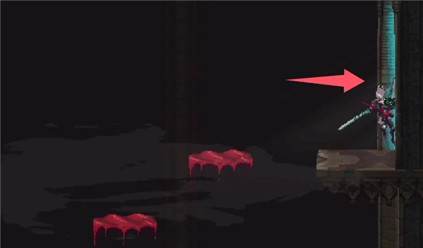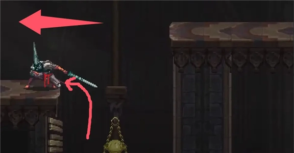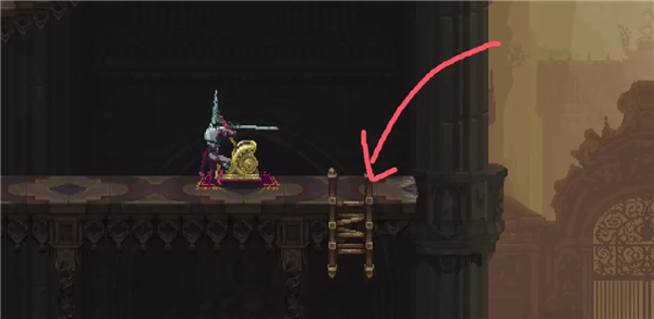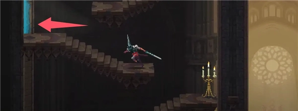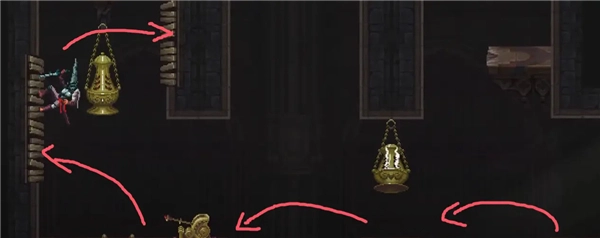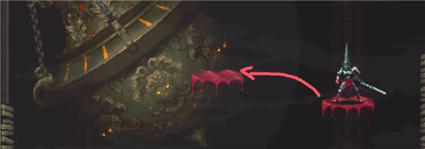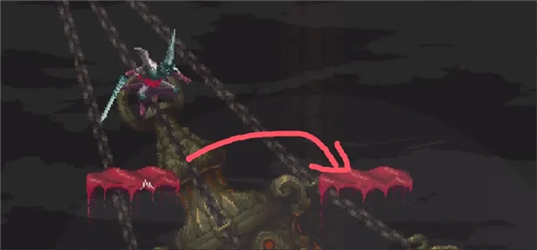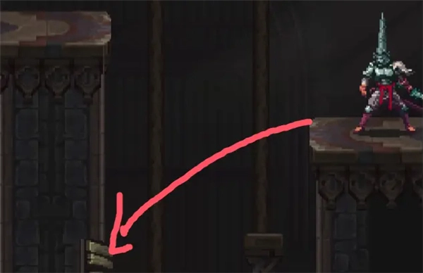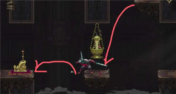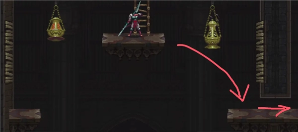 ②跳到香炉下方的平台,接着往左边跳,打开回存档点的捷径。要是血量不足就先回去存档,但之后还是得回到这个捷径的位置。