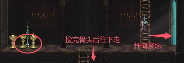 在一堆圣杯里捡到妓女琼恩的髋骨。髋骨右侧的门通往忏悔祭坛,要是需要捡尸就去那里。之后顺着梯子往下走。