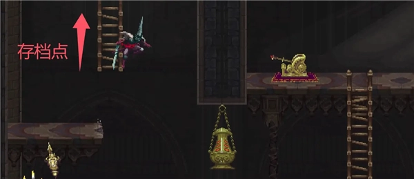 从梯子下到下方的平台后,往左边走再向上攀爬,就能到达大教堂屋顶的存档点了。