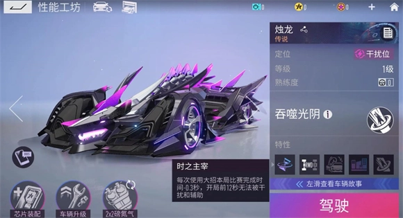 烛龙,强度评级T0。其大招效果为加速推进,最高时速可达40千米,持续8秒;同时能让200米范围内敌方车辆的完成时间增加0.3秒,角色等级达到10级后,该效果可无视敌方隐身状态,且无法被净化。被动技能方面,烛龙每次释放大招,自身完成时间会减少0.3秒;开局后的前12秒处于无法选中状态,且每秒自动充能3%。当角色等级提升至8级,大招将解锁额外被动:敌方车辆每使用4次氮气,完成时间就会增加0.3秒。此外,开局时的无法选中状态,能够免疫泰坦/坦克300的重击减益效果、月宫圣使的脱兔减益效果、星穹幻音的幻梦减益效果,以及咆哮虎开局施加的混乱效果等。