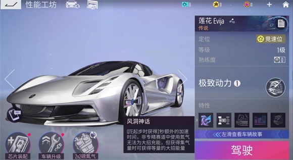 莲花 Evjia(T0级)的大招效果为:开启后进入加速推进状态,速度提升50km/h,持续6秒;在此期间,每使用一次氮气,可获得2秒隐身效果,同时大招持续时间延长1.2秒,且大招的推进速度额外增加8km/h(该额外速度上限为40km/h)。被动特性方面:起步加速的持续时间增加2秒;在非专精赛道中,氮气无法为大招充能,但集气过程中会同步积累大招能量。