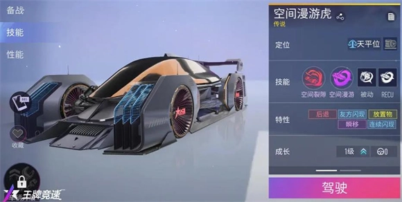 空间漫游虎,T1级别赛车。开启大招后,会在前方50米处生成持续4秒的空间漩涡,自身穿过漩涡可向前闪现,最远距离为70米。队友穿过该漩涡后,6秒内首次使用氮气时,将额外闪现30米;敌方车辆穿过漩涡后,6秒内首次使用氮气时,则会强制后退30米,此效果无法被净化。其SP技能为:向前闪现至最近的车辆位置,闪现距离上限60米、下限10米,冷却时间25秒。被动效果是:当场上有其他车辆进行闪现操作时,自身下一次释放大招的闪现距离将额外增加30米。