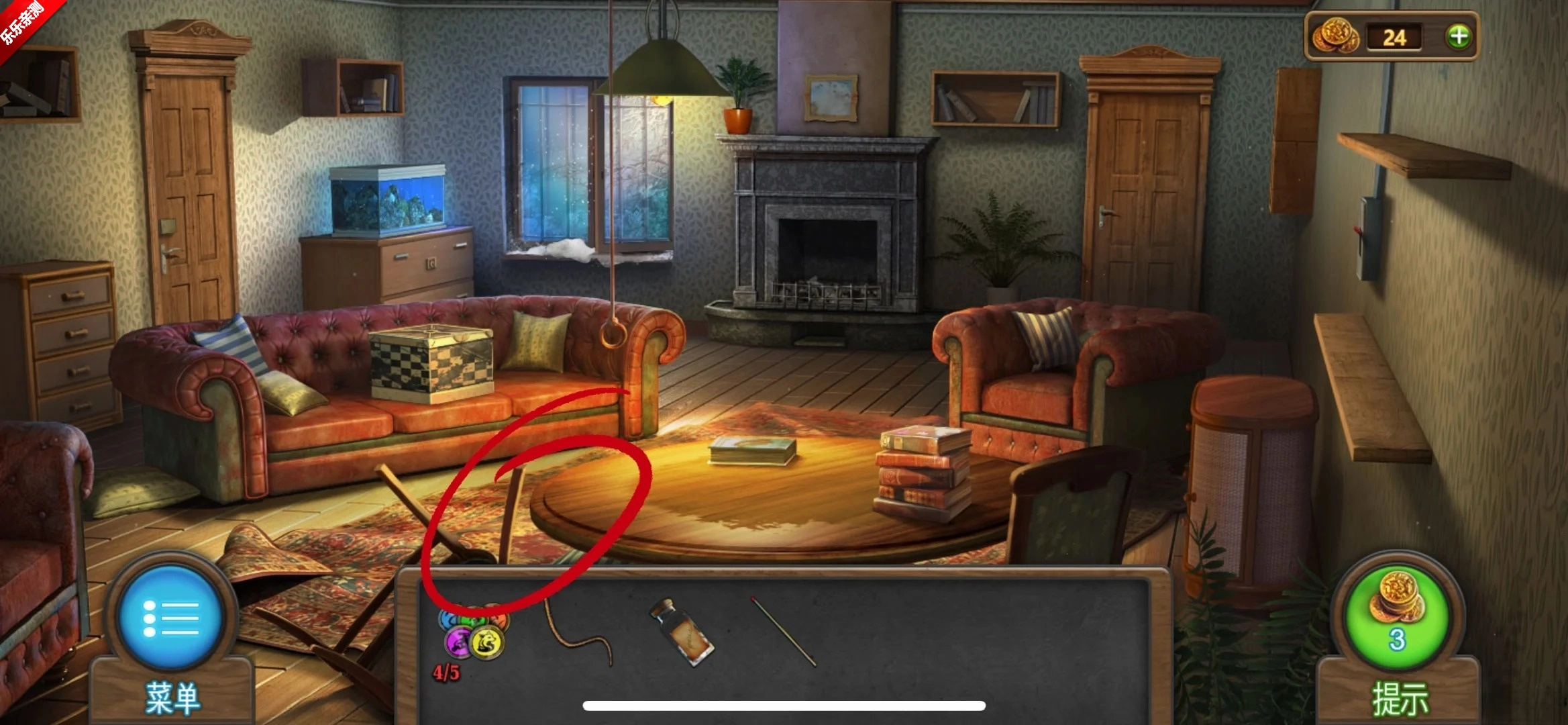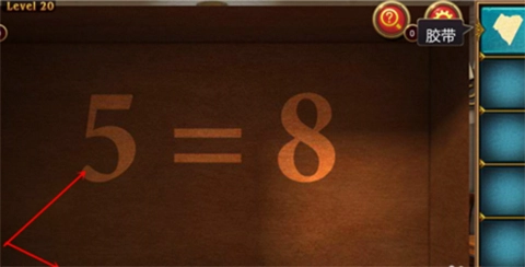点击中间的桌子,获取胶带。点击左侧的纸签,再次点击以记录上面的数字提示“4=5”以及蓝色圆点的提示。