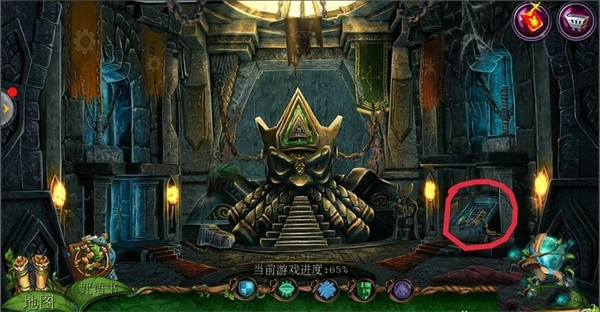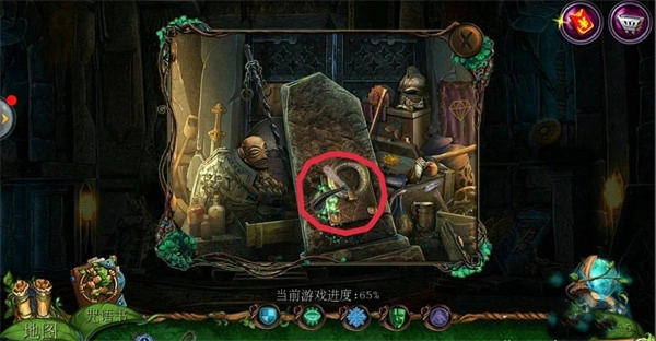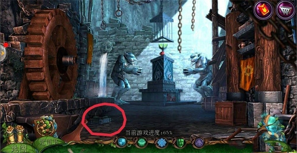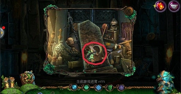 点击左侧场景中的【哥布林房间】,再点击中间下方的齿轮;在齿轮附近获取【铁链】;使用【八边形钥匙】开启机关,随后在地面上拿到【镰刀】。