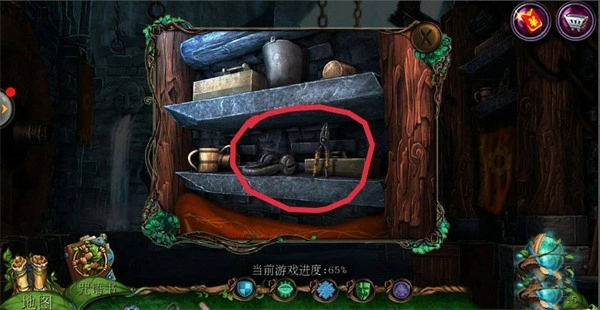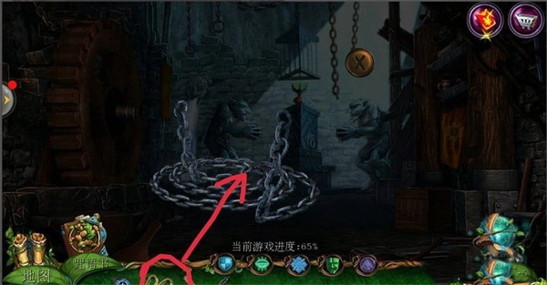 出来,把【带镣铐的链子】放置在左边的矮人身上;接着点击左边的【矮人】,将右边机关的石板拉开。