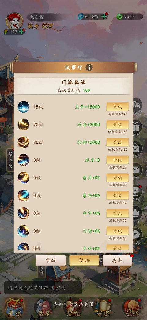 这是主城的议事厅,在这里贡献可以获得贡献值,之后能用这些贡献值升级秘法;前期建议优先提升生命、攻击和防御这几项,这样带来的提升会比较显著。