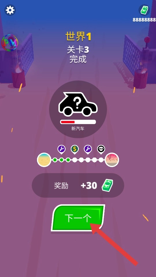 关卡完成后,点击【下一个】按钮进入下一关,即可获得金币奖励并解锁新汽车。