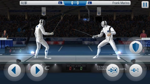 游戏采用虚拟按键操作,方式简便,和横版格斗游戏的操作逻辑相近:左侧的箭头按键用于控制运动员的前后移动,右侧则分布着弓步突刺、直刺、格挡等招式按键。玩家需要操控运动员与对手维持恰当的距离,并对出招方式做出判断,这样就能击中对手的有效部位,进而获取相应的比分。