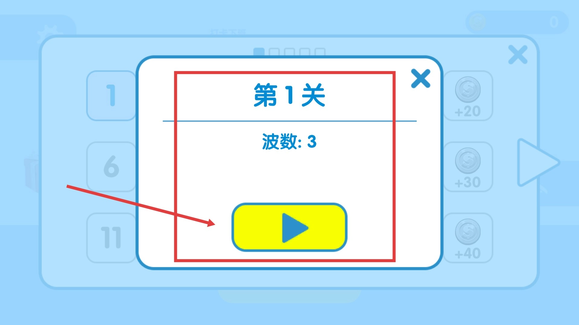在关卡选择页面,挑选【第1关】且波数设定为【3】的关卡,点击黄色的开始按钮,就能进入具体的关卡进行挑战。