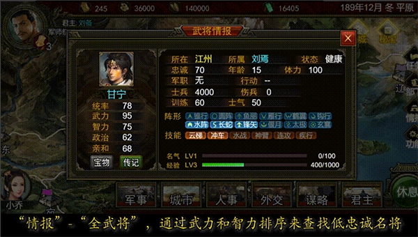 ◆怎样锁定可挖角的武将:参照上图所示,进入情报界面的全武将列表,接着依据武力、智力或政治属性进行排序,那些忠诚度为80且属性数值较高的武将,便是你可以争取的目标。