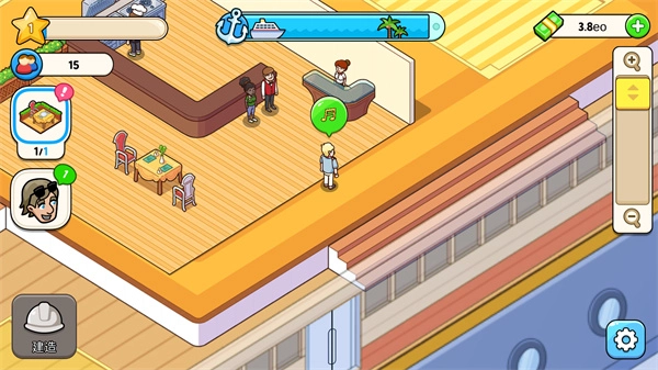 当你拥有了足够数量的货币,点击建造按钮就能修建餐饮场所、客舱和各类娱乐设施,要留意部分建造项目需要满足对应的等级条件才能进行。