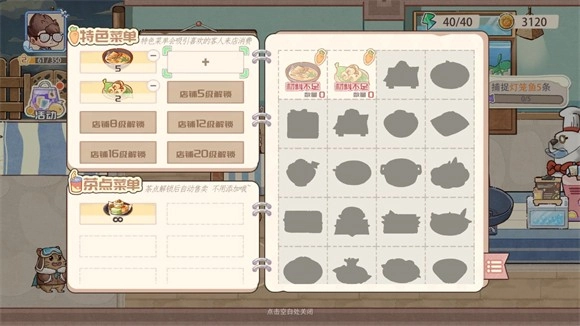 2、进入餐厅后点击菜单板可以添加不同的菜品,餐厅的等级越高可以售出的菜品数量越多。