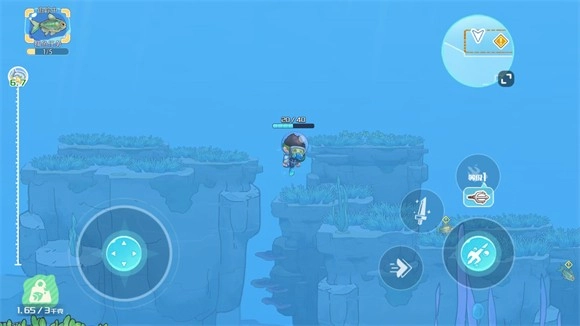 6、捕鱼过程中左边控制角色移动,右边可以发射鱼叉来捕鱼,角色头顶是氧气,消耗完就需要返回岸上。