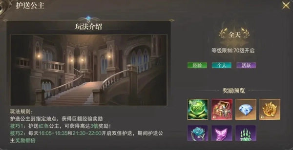 【护送公主!光彩加冕】护送公主至宁静之地!不但好汉风格尽显!更有巨额履历嘉奖等您来领!本领1:选择赤色公主!嘉奖刹时飙升3倍!本领2:紧盯时间表!逐日16:05-16:35与21:30-22:00!双倍护送时段!嘉奖翻倍乐不断!