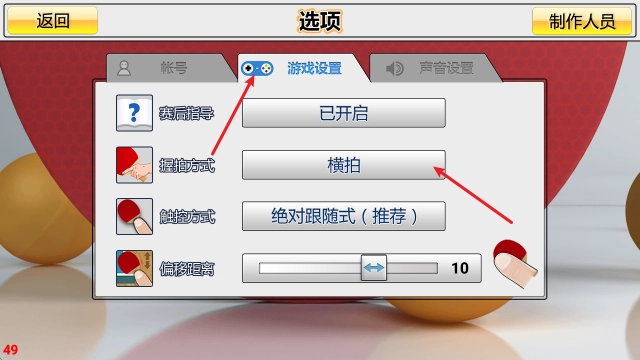 接下来选择游戏设置,在这个界面里点击握拍方式,就能在横拍和竖拍之间进行切换了。
