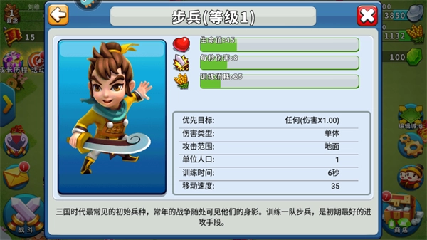三国时期最常见的初始兵种,因常年战乱,他们的身影随处可见。训练一队步兵,是初期最佳的进攻方式。