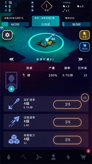 解锁矿区后系统会自动进行采矿作业,点击矿区可消耗金币提升采集效率、运输效率与装载能力。