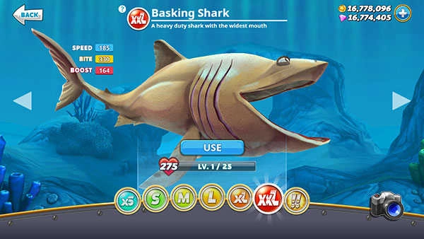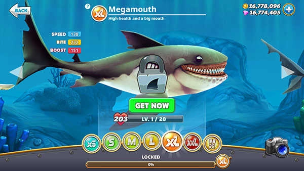 积分条填满后(玩游戏可获取积分)就能解锁该型号鲨鱼,之后再用金币购买。