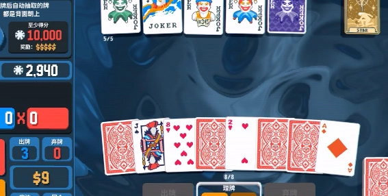 随着回合的推进,分数要求会不断提高,通过发牌、弃牌等操作组合牌组以获取更高分数。