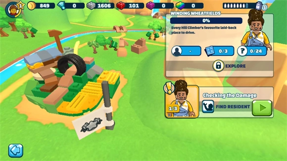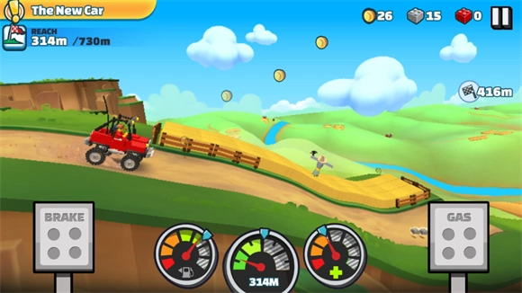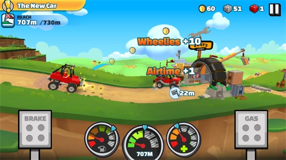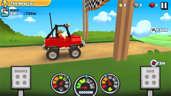 控制车辆向前行驶,收集积木与金币,路上会遇到各类可收集使用的道具,成功到达终点即可完成关卡。