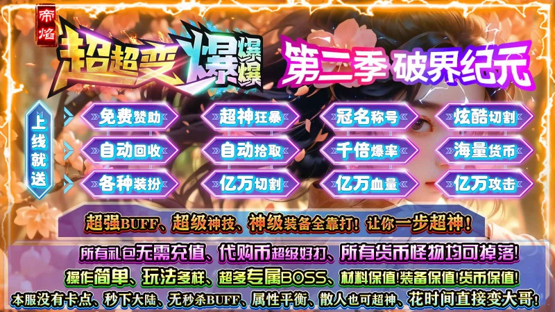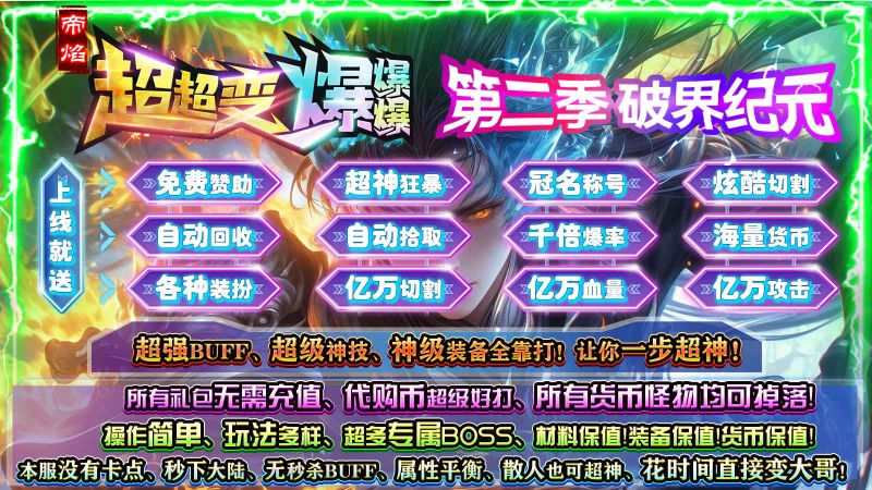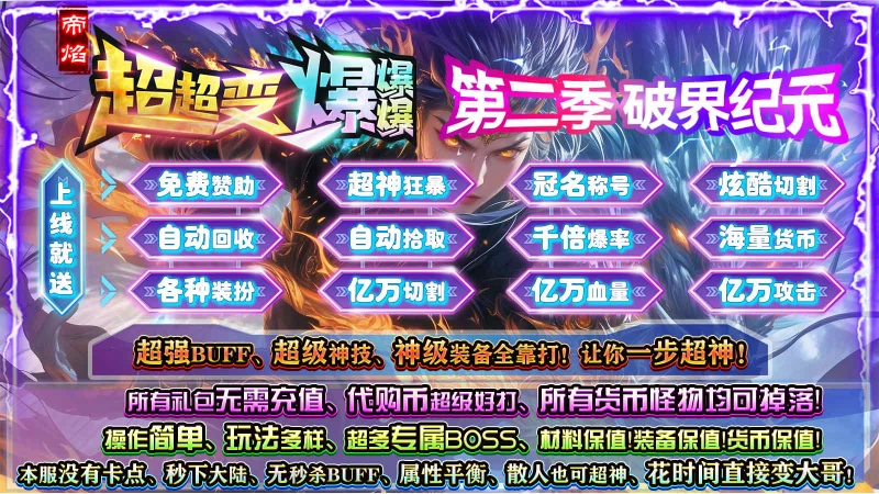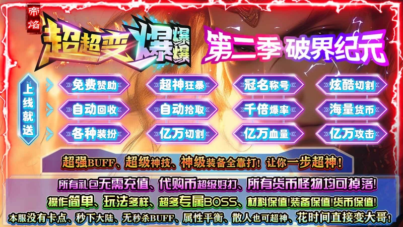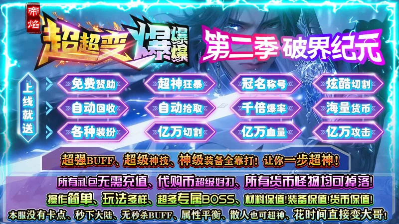 帝焰超变无限爆,195单职业超变版本,货币、礼包全靠手打,低消费也能畅享高燃激情!免费赞助、超神狂暴、冠名称号、炫酷切割等丰厚福利,上线即免费赠送;亿万切割、亿万血量、亿万攻击加持,砍怪快感持续拉满!打怪千倍爆率爽不停,海量货币轻松白嫖,散人无需氪金也能逆袭超神,只要肯花时间就能成为游戏大哥!