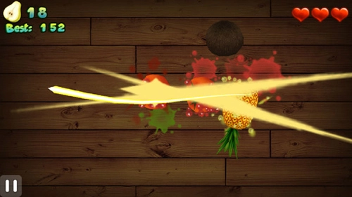 滑动手指,把那些萌萌的水果切成两半,碰到炸弹会扣分,遇到闹钟则能增加时间。