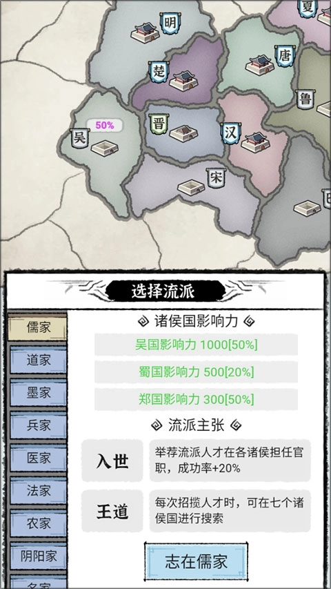 选择流派,百家学派各有专长,对各方势力的影响程度也皆不同,你可以自由选择喜欢的流派开始管理,主张自己独特的信念。