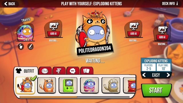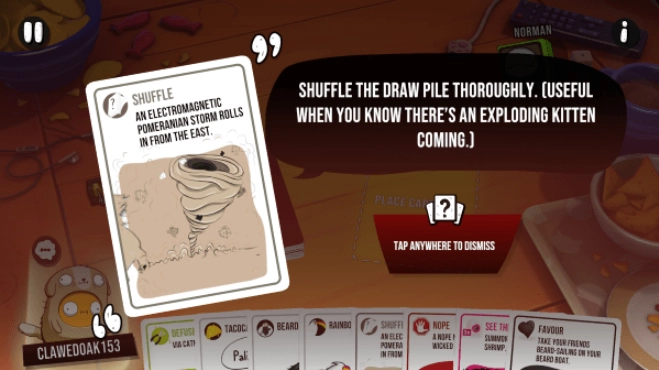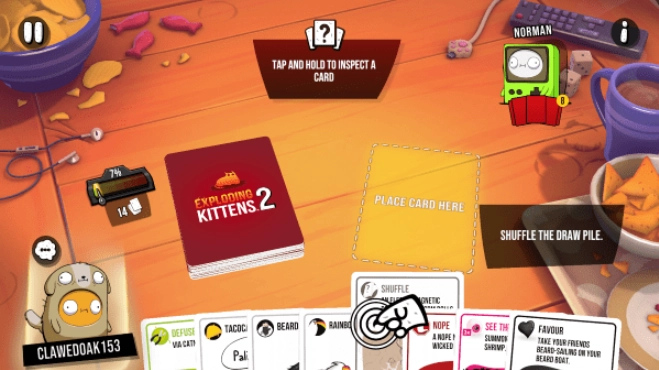 爆炸小猫2(Exploding Kittens2),是一款玩法独特又有趣的回合制卡牌游戏。玩家需要打出各种带有特殊效果的卡牌进行对战,尽量让自己手中不留下炸弹牌,坚持到最后的人就能赢得胜利!游戏里可以选择和人机对战来熟悉规则,也能匹配其他玩家开启刺激的较量,还能和小伙伴们联机玩耍,比比谁才是最厉害的小猫!另外,玩家还能自定义头像和有趣的表情符号,为你带来更丰富有趣的游戏体验!