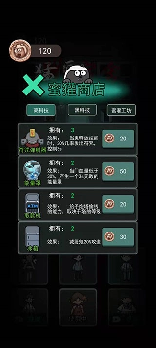 玩家每次结束游戏后都能获取一定数量的蜜獾币,点击右上角的蜜獾商店,在商店内持续升级自身属性,就能让玩家在下次游戏时获得额外的攻击与防御加成,从而更轻松地应对猛鬼的攻击。