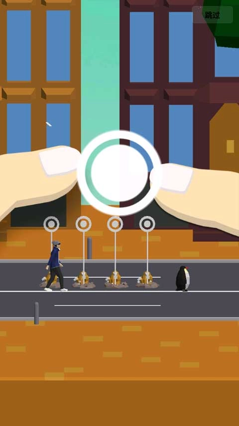现在开始练习,当看到这种圆圈形状的立牌时,用点击屏幕的方法来消除它。要留意的是,每次经过的动物都不相同,并且每个动物都有其独特的节奏,要认真体会并熟练把握这种节奏。