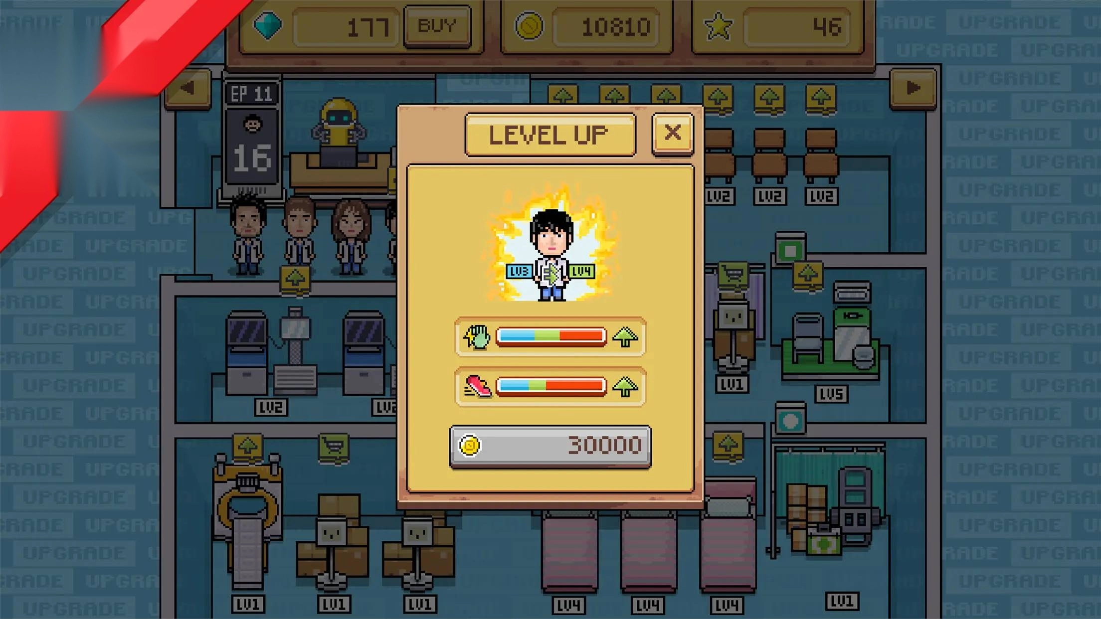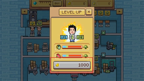 成功通过第一关后,玩家需要点击屏幕上角色头顶的绿色小按钮来完成升级。