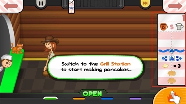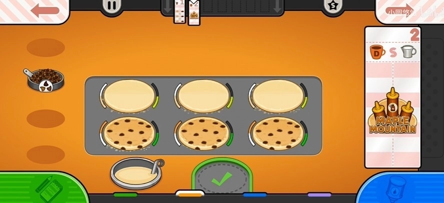 接到订单后,请点击屏幕左下角的第二个“黄色按钮”,接着点击下方的酱盆,再点击煎饼器,这样就能把煎饼原料放入其中了。