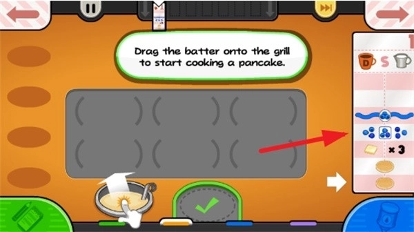 煎制煎饼时需留意火候,当煎饼右侧的能量条走到一半位置时,点击煎饼使其翻面接着煎。等两面都煎熟后,按住煎饼拖动到右侧订单下方的盘子里就可以了。