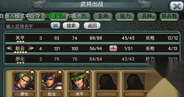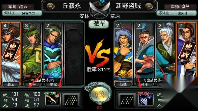 选择武将的出战顺序至关重要,出征前务必补满生命值、技能值与士兵数量,尽量搭配不同兵种的武将,优先派遣能克制敌军的兵种出战,己方的高级武将则留到关键时刻再与敌方高级将领交锋。