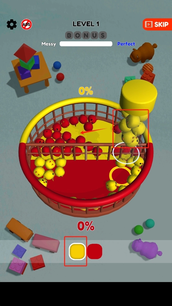 点击屏幕下方的按钮即可开始游戏,你的目标是利用对应颜色的圆柱工具,将红色和黄色这两类小球分别归置到它们各自对应的颜色区域中。