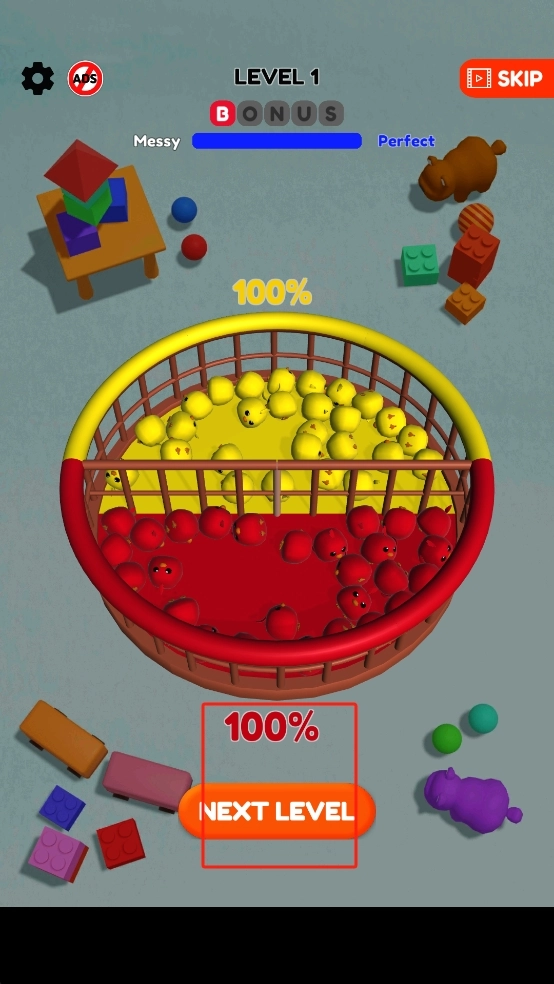 当两类球都回到正确位置、进度条显示100%后,点击“NEXT LEVEL”按钮,即可进入下一关,挑战难度更高的分类整理任务。