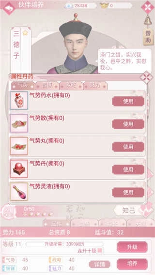 每个伙伴的资料里都清楚标注了他们的主要属性,给他们投喂和主属性对应的丹药,就能有效增强他们的战力。要是你把资源都集中在提升某个伙伴的属性上,可能确实更容易通过关卡,但在宫斗环节或许会碰到不小的麻烦,所以还是建议你均衡提升各个伙伴的属性比较好。