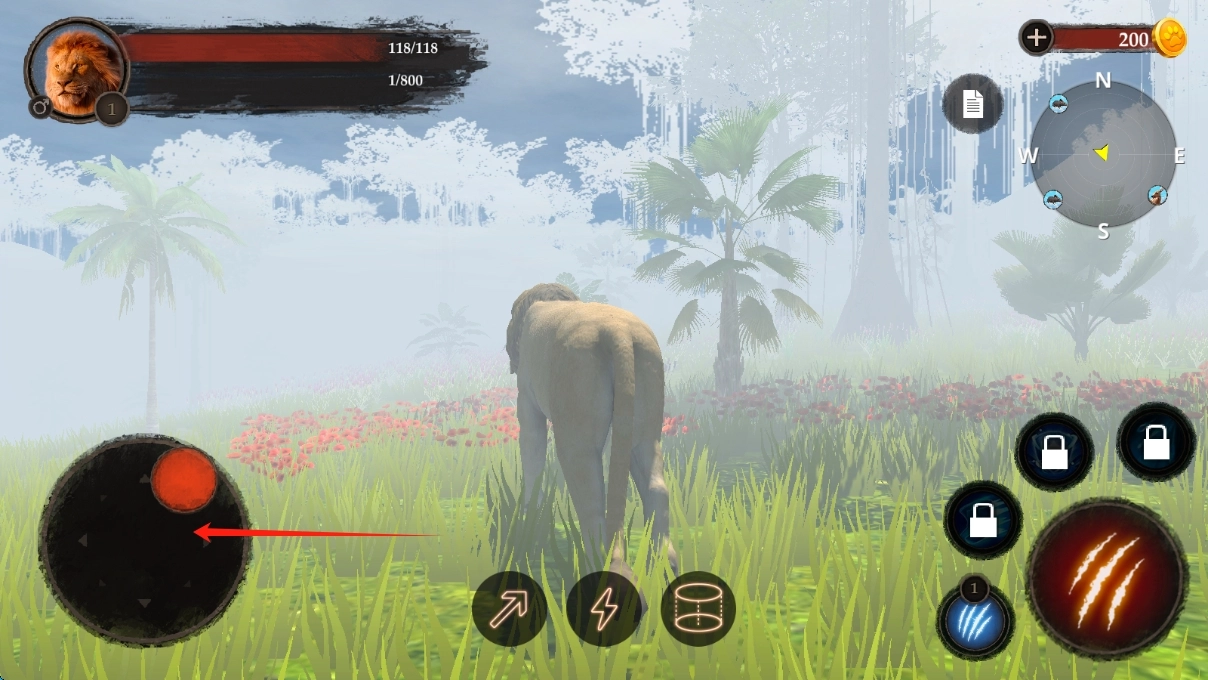 在游戏里,你可以通过滑动左侧的虚拟摇杆,操控狮子在草原场景中移动和探索,也能拨动轮盘来移动人物。
