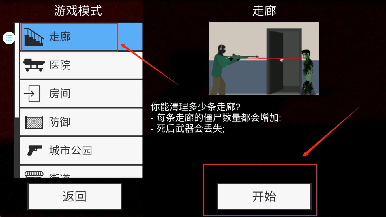 点击进入后,你可以在此处切换不同的枪支和人物姿势,再点击下方的“开始”按钮就能进入游戏了。