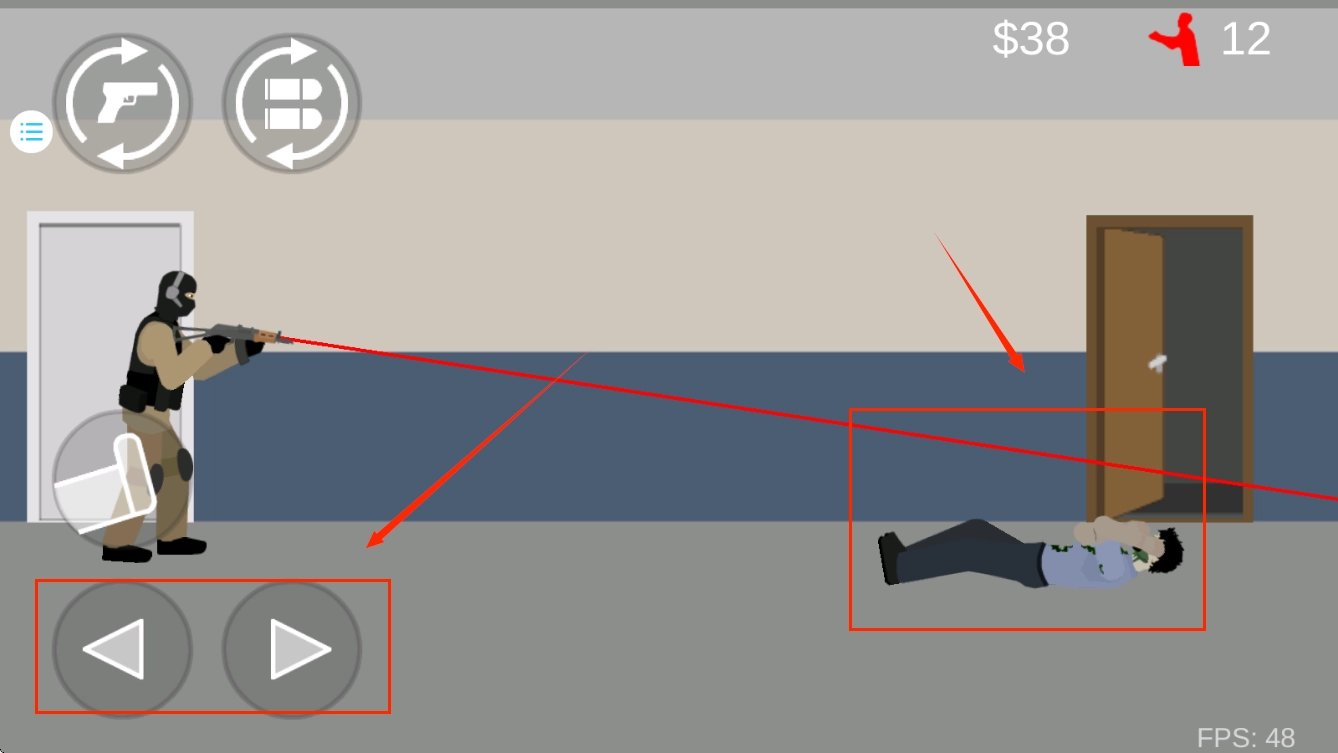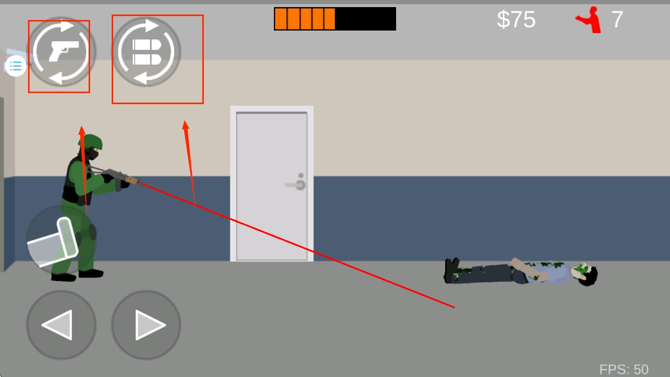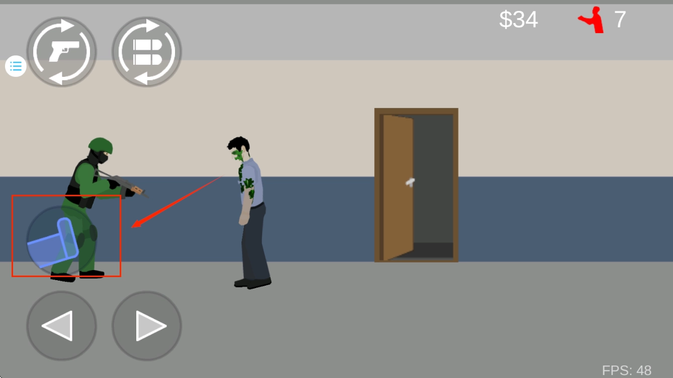左上角的两个按键,第一个是切换武器,第二个是装填弹药。在装填弹药的过程中,我们可以向后移动,和僵尸拉开一定距离,避免被它攻击而减少生命值。