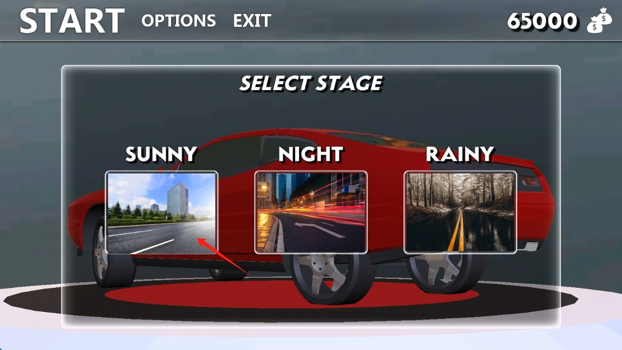 进入关卡选择界面,按照箭头的指引,选定Sunny关卡,确认好比赛的路线,为接下来的赛车挑战做好准备,然后点击选择对应的地图。