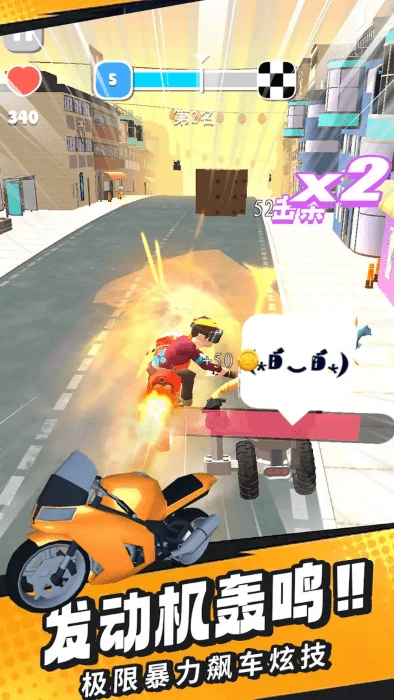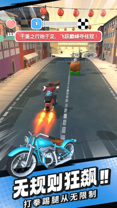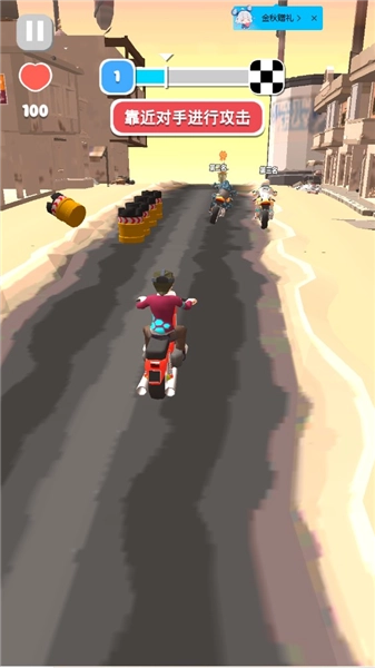 玩家在赛道上既要保持高速行驶,还可以利用拳脚或武器攻击来干扰对手。发起攻击时得留意节奏和距离,抓住合适的时机就能快速实现反超。