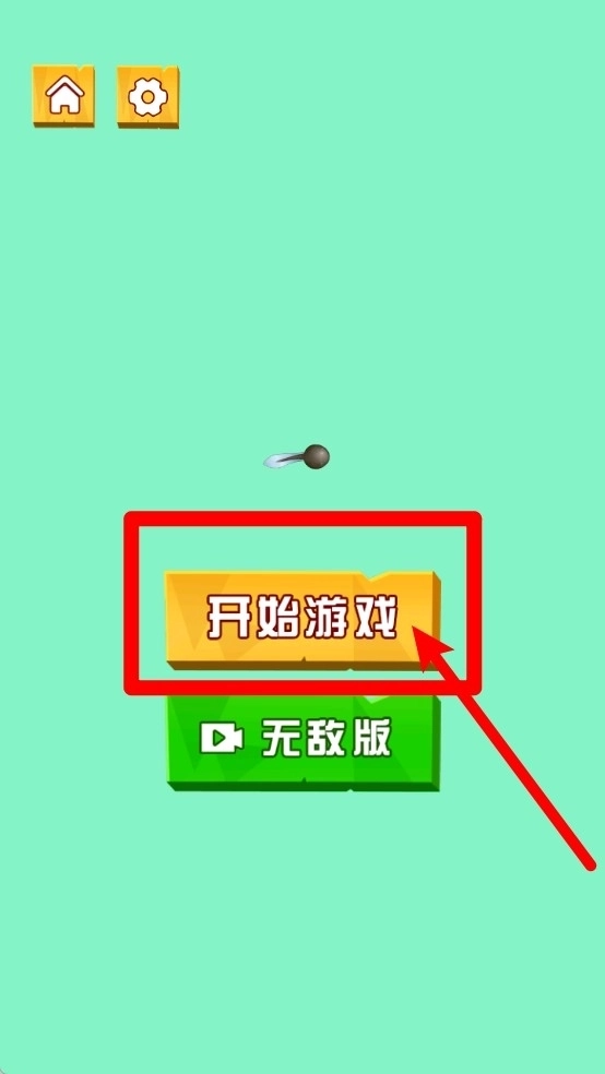 主菜单界面的操作说明如下:点击“开始游戏”按钮即可进入关卡,也可以选择“无敌版”来体验不同的游戏模式;界面左上角的房屋图标和齿轮图标分别用于返回主页和进入设置界面。
