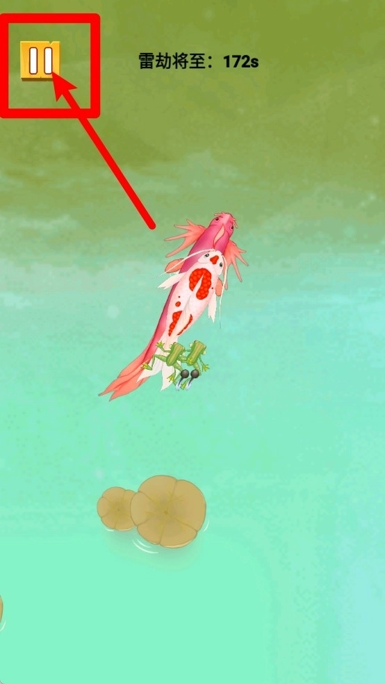 作战提示界面:左上角暂停键可暂离,雷劫倒计时显示剩余时间,操控小鱼避强就弱并优先吞噬小体目标。
