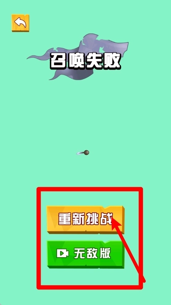 召唤失败界面:点击“重新挑战”按钮可直接重新开启当前关卡,也可以选择观看视频进入无敌模式,在此建议您复盘一下刚才的走位策略和道具使用节奏。